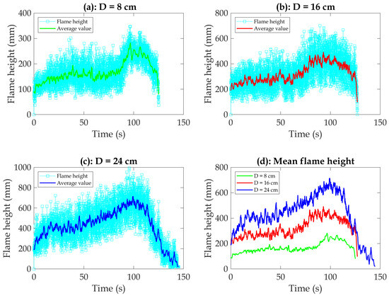 (a) Temporal evolution of flame height for D = 8 cm. (b) Temporal evolution of flame height for D = 16 cm. (c) Temporal evolution of flame height for D = 24 cm. (d) Comparison of mean flame heights for different pan diameters.