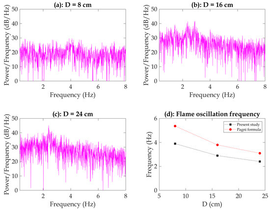 As shown in Figure 10, the results indicate that the pan diameter has a noticeable impact on the flame oscillation frequency. The mean frequency for the 8 cm pan (3.9 Hz) is higher than that for the 16 cm pan (2.9 Hz). This observation aligns with the calculation using the Pagni formula, [42], which suggests that flame pulsations are affected by the pan diameter. A larger pan diameter provides more space for the flame to oscillate and creates different flow patterns around it, resulting in a lower oscillation frequency.