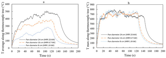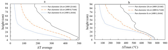 Furthermore, Figure 13 indicates that the maximum temperature along the thermocouple tree remains relatively similar for pan diameters of 8, 16, and 24 cm (approximately 650–). Intriguingly, the maximum temperature recorded by the thermocouple appears to be independent of the pan’s diameter. However, for the 24 cm diameter pan, the maximum temperature appears to decrease after 80 s. This could be attributed to the production of soot, smoke, and particles, which subsequently hinder the fire’s radiation. Nevertheless, additional research is necessary to substantiate this observation. The temperature can also be expressed as a function of the tree height, as shown in Figure 14. In this context, represents the difference between the measured temperature and the initial room temperature of the compartment. Figure 14 depicts the increase in average or maximum temperatures on the compartment ceiling as the fire size expands. Generally, there is a rise in the time-averaged temperature at a specific position along the tree as the pan size increases. However, the maximum temperature does not appear to exhibit significant changes with varying pan sizes. Interestingly, this study’s findings differ from those of Wang et al. [3], who also examined temperature variations along the flame’s centerline. Wang et al. conducted experiments using various pan sizes, including two cases comparable to this study: 20 cm and 25 cm pan diameters. Their results indicated a lower maximum temperature of approximately . This difference can be attributed to the distance between the nearest thermocouple and the fuel surface. In Wang et al.’s study, this distance was around 34 cm, whereas in this study, the first thermocouple was placed closer to the fuel surface, specifically on the pan’s tip. Wang et al. also proposed that the variation could be due to a wandering fire. Additionally, differences in compartment volume exist between the two studies. Nevertheless, both studies exhibit a similar pattern in terms of average temperature, which tends to increase over time [3].