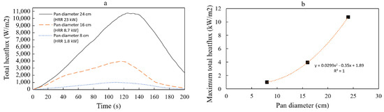 Therefore, we can assume that pan area and heat flux have somewhat linear relationships. With this assumption, we calculated the increments in time-averaged heat flux and maximum heat flux for a 1 cm2 increment in pan area. For a 1 cm2 increase in pan area, the time-averaged heat flux increased by approximately 0.01 , while the maximum heat flux increased by approximately 0.02 . These values highlight the sensitivity of total heat flux to changes in fire size, represented by the pan area. For the relationship between pan diameter and heat flux, as we know, the pan area in a circular pan can be calculated by . This explains why the maximum total heat flux, as shown in Figure 15, demonstrates a second-order polynomial trend, especially in this study, within the range of 8 to 24 cm diameter of heptane pool fires. However, further research is required to validate this observation.