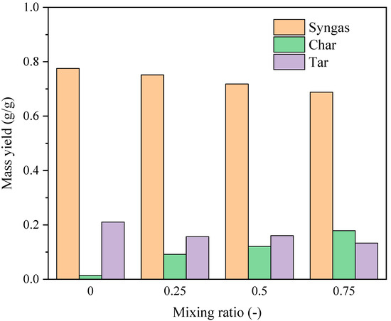 The effects of the mixing of water hyacinth with PP plastic on the gas–liquid–solid three-phase mass yields are shown in Figure 2. The results show that the tar production can be effectively decreased from 0.21 to 0.13 g/g with the increase in the water hyacinth mixing ratio from 0 to 0.75. On the other hand, the syngas yield slightly decreases from 0.78 to 0.69 g/g. Moreover, the mass yield of char continues to increase from 0.01 to 0.18 g/g with the increase in mixing ratio. Due to the high volatile content and low contents of ash and fixed carbon, most of the selected PP plastic can be transformed into gas products in the early pyrolysis stage of chemical looping gasification, and thus semi-coke gasification in subsequent stages is not required. As a result, there is almost no incomplete char component in the product for the condition of pure PP plastic [31].