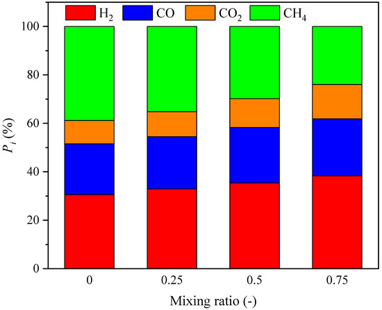 Figure 3 and Figure 4 display the effect of the water hyacinth mixing ratio on the syngas yield and composition distribution. The results show that with the increase in water hyacinth content, the total gas yield keeps decreasing from 1.05 Nm3/kg for pure PP plastic to 0.9 Nm3/kg with the mixing ratio of 0.75. This is mainly because the decrease in high-volatile PP plastic lowers the overall volatile fraction of the mixed fuel. Thus, in the early pyrolysis stage of chemical looping gasification, fewer gas products are released, which reduces the total gas yield [31]. Accordingly, the yield of CH4 is also obviously reduced from 0.41 Nm3/kg for pure PP plastic to 0.21 Nm3/kg for the mixing ratio of 0.75. However, the CO yield remains almost constant. Moreover, the H2 yield slightly increases with the increasing water hyacinth content, reaching a maximum of 0.34 Nm3/kg at the condition of 0.75 mixing ratio. This is mainly because plastics are hydrocarbon polymers formed by addition polymerization, and PP plastics are formed by adding methyl molecules (-CH3) to conventional hydrocarbon structures. Thus, in the pyrolysis stage, a large number of -CH3 free radicals are generated, which makes it easier to generate hydrocarbons including CH4. Afterward, a series of reforming reactions occur with steam, and a series of oxidation reactions occur with lattice oxygen released by the iron ore oxygen carrier, resulting in the generation of CO and CO2.