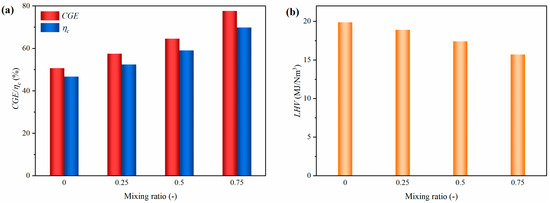 Effect of water hyacinth mixing ratio on cold gas efficiency and carbon conversion (a) and lower heating value (b).