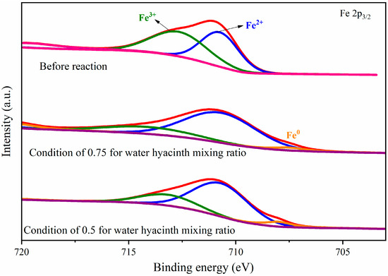 Table 2 lists the relative content changes of Fe element valence states and shows that in the fresh oxygen carrier, the atomic ratios of Fe3+ and Fe2+ are 51.77% and 48.23%, respectively, and Fe0 is not detected. In the condition of 0.75 for the water hyacinth mixing ratio, the atomic ratios of Fe3+, Fe2+,, and Fe0 in the oxygen carrier are 21.22%, 73.86%, and 4.92%, respectively. In the condition of 0.5 for the water hyacinth mixing ratio, the atomic ratios of Fe3+, Fe2+, and Fe0 in the oxygen carrier are 22.87%, 69.67%, and 7.46%, respectively. The results show that in the oxygen carrier after the reaction, the proportion of Fe3+ decreases significantly, while the proportions of Fe2+ and Fe0 increase, indicating that Fe2O3 has been gradually reduced to Fe3O4, FeO, and Fe.