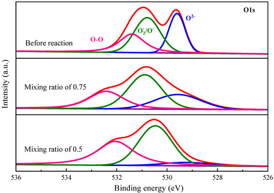 The XPS characterization results of O element valence states in oxygen carriers are shown in Figure 8, and the relative content changes of each O element valence state are shown in Table 3. The results show that the relative contents of crystal lattice oxygen, chemisorbed oxygen and physical adsorbed oxygen atoms on the surface of fresh oxygen carrier were 29.7%, 41.76%, and 28.53%, respectively. Accordingly, the ratios of crystal lattice oxygen, chemisorbed oxygen, and physical adsorbed oxygen atoms on the surface of the oxygen carrier under the conditions of 0.75 and 0.5 for water hyacinth mixing ratio are 15.65% and 5.86%, 45.66% and 49.07%, and 38.69% and 45.07%, respectively. The results indicate that the oxygen carrier under 0.75 and 0.5 conditions can transform most of the lattice oxygen in the bulk phase into physical adsorption oxygen through oxygen vacancy for the gasification reaction.