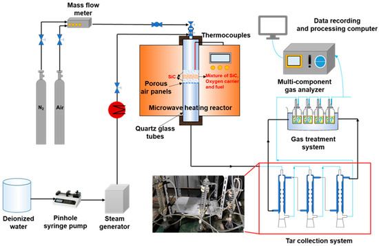 The fixed bed experimental device for microwave chemical looping gasification mainly consists of a microwave reactor, feed system, gas treatment system, online analysis system, and tar collection system (as shown in Scheme 1). The detailed description of the reactor system can be found elsewhere [30].