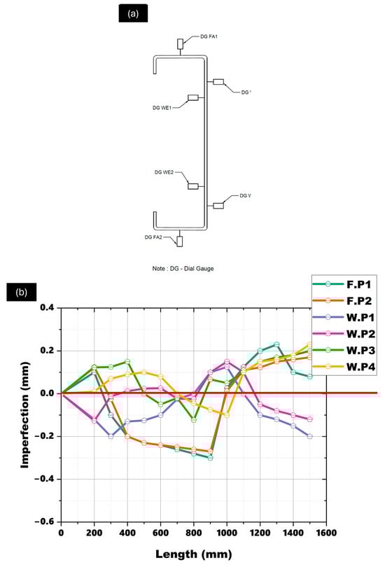 To accurately assess the impact of geometric imperfections on the structural behavior of CFS sections, detailed measurements were taken for all test specimens. These imperfections, typically arising from manufacturing processes such as rolling, welding, and fastening, were systematically documented. Figure 3a depicts locations on the specimen where imperfection measurements were taken. Figure 3b illustrates the measurement points along the length of the specimens, with six key locations on both the flange and the web. The points are labeled “FP1” for the flange and “WP1” for the web at each position. Measurements were taken at 50 mm intervals along the specimen’s length to capture deviations from the intended geometry. To ensure accuracy, each specimen was placed on a perfectly level surface, with one end clamped to eliminate external movements during the measurement process. A digital dial gauge with a sensitivity of 0.01 mm was used to record the imperfections. This approach ensured that even minor deviations influencing the structural response under load were included in the analysis. The purpose of measuring initial imperfections provided a baseline for assessing distortional buckling and failure by analyzing geometric imperfections before thermal exposure incorporated into FE models to replicate realistic conditions, reflecting the imperfect geometry of practical CFS members, and allowed experimental data to be compared with FE model predictions, ensuring alignment with actual specimen behavior. Thermal expansion and contraction likely caused increased out-of-straightness, local buckling, or warping due to uneven thermal gradients. However, post-exposure measurements were not conducted due to experimental limitations. These changes can affect buckling resistance, and future studies should include post-heating measurements to assess thermal effects on geometry.