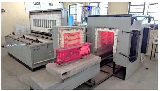 The test specimens were heated in an electric furnace to simulate real-world fire conditions (Figure 5). The furnace used electrical heating coils embedded within refractory masonry, positioned on both sides of the specimens to ensure even heat distribution. This setup allowed for controlled exposure to elevated temperatures, closely mimicking fire conditions. The specimens were heated according to the ISO 834 standard fire curve [], which outlines typical temperature increases during a fire. Two heating durations were employed: 60 min and 90 min. After 60 min, the specimens reached 925 °C, and after 90 min, they reached 986 °C. These durations were selected to assess the effects of prolonged exposure to high temperatures and simulate different fire scenarios that CFS sections might experience in the field.