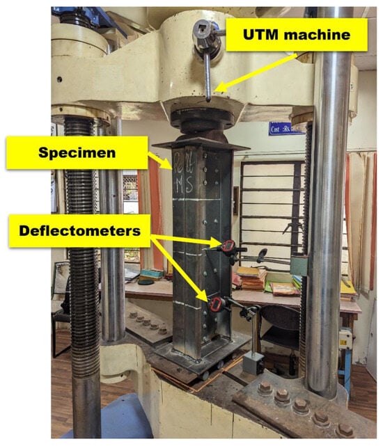 Testing was conducted using a computerized Universal Testing Machine (UTM) with a 1000 kN capacity, which applied concentric axial compressive loads at a rate of 10 kN/s to ensure consistency. A data acquisition system recorded the total displacement resulting from the applied compressive stress. Two deflectometers were placed on each specimen to monitor lateral displacement: One at the midpoint of the specimen and the other one near the support (Figure 6).