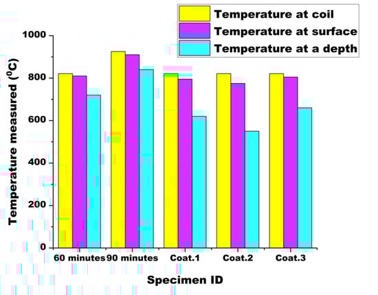 All the specimens exhibited a mat brown color across their surfaces, as illustrated in Figure 1. However, upon exposure to high temperatures for 60 min and 90 min, significant changes in the color and surface condition of the specimens were observed. For the uncoated specimens, the surface color transformed to dark brown after being heated, indicating the beginning of material degradation due to the elevated temperatures. In the case of the coated specimens, the following observations were made: