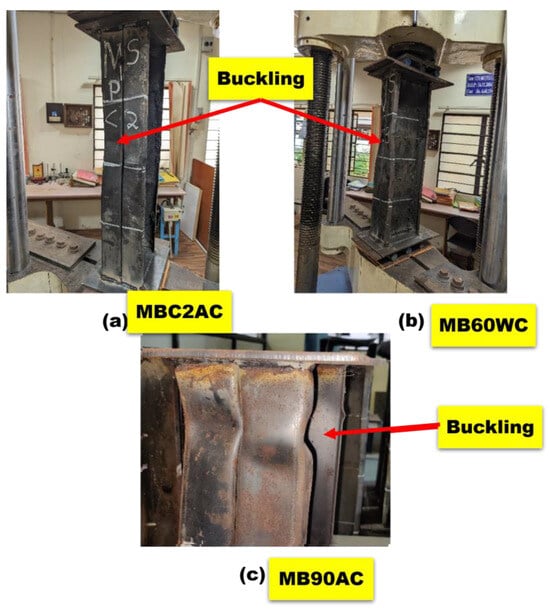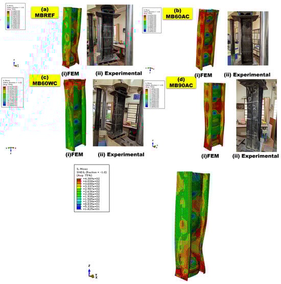 The FE model aimed to replicate experimental conditions to analyze failure mechanisms (local, distortional, global buckling). It was also used for parametric studies on thermal exposure, imperfections, and coating effects. The validation of the FE model was conducted by comparing the ultimate loads and failure modes with experimental outcomes, demonstrating a strong correlation between the two approaches. The FE simulations accurately replicated the load-bearing capacities of the CFS columns under various heating and cooling scenarios. Both the experimental and numerical results consistently exhibited similar failure mechanisms, as illustrated in Figure 15 and Figure 16. At ambient conditions, the columns primarily failed due to web buckling, a characteristic mode of failure for slender, thin-walled sections like CFS columns under axial compression. This behavior was mirrored in the FEM results, confirming the model’s ability to capture the intrinsic structural response. For specimens subjected to elevated temperatures and cooled either by air or water, the failure mode largely remained web buckling, indicating that the primary structural behavior of the sections persisted despite thermal exposure. However, local buckling of the flanges became more prominent as the heating duration increased, particularly in sections subjected to prolonged exposure. The pronounced buckling in the upper halves of the BB sections was observed in both experimental and numerical studies. This can be attributed to stress concentration in these regions due to the distribution of axial loads and the inherent geometry of the sections. While the lower halves also experienced deformations, these were comparatively less severe, reflecting the stress gradient along the height of the section. A key observation was the influence of heating and cooling methods on the failure modes. Prolonged heating led to material softening, causing additional local deformations, especially in the flange regions. Specimens cooled by water exhibited slightly more severe buckling compared to those cooled by air, consistent with the observed microstructural changes and residual stresses induced by rapid cooling. The FEM model effectively integrated temperature-dependent material properties and thermal effects, enabling a precise simulation of the structural response under various conditions. It accurately predicted both the failure modes and the load capacities, capturing the impacts of elevated temperatures and different cooling methods on the structural behavior.