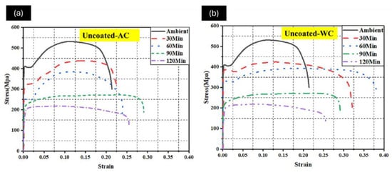 Figure 17 presents the variation in buckling stress for BB connected sections exposed to different heating durations and coatings, subsequently cooled to ambient temperature through either air or water. The behavior of these sections under axial compression is heavily influenced by both the duration of thermal exposure and the resulting degradation in material strength. Buckling stress, the critical stress causing instability due to compression, depends on material properties, geometry, boundary, and loading conditions. In this study, it was calculated analytically using equations (Equation (1)) incorporating temperature-dependent material properties.