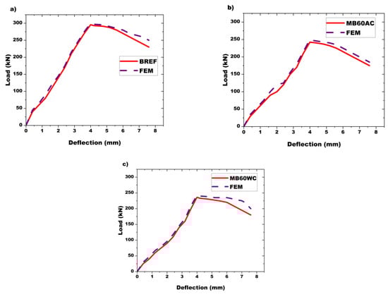 Comparison of failure modes from the experimental tests and FEM for (a) MBREF, (b) MB60AC, (c) MB60WC, (d) MB90AC.