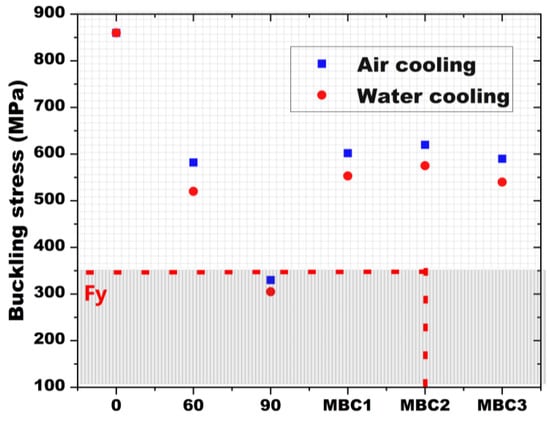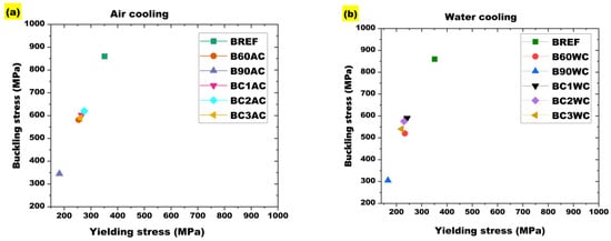 Relationship obtained between buckling stress and yield stress under (a) air cooling and (b) water cooling.