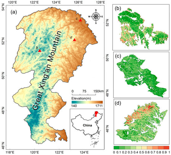 Location of the Great Xing’an Mountains (a) in Northeastern China. Three Landsat-derived relative differenced normalized burn ratio (RdNBR) images represent the burn severity patterns of three extreme fire events: the Genhe Fire (b), the Huma Fire (c), and the Kanduhe Fire (d). The RdNBR was used to quantify postfire ecosystem changes (see b–d). Higher RdNBR values represent higher burn severity.