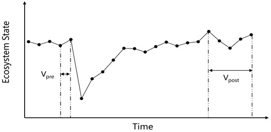 We defined resilience as the capacity of an ecosystem to revert to its prefire state or to realign and stabilize under new conditions following a perturbation. An ecosystem exhibiting high resilience can swiftly regain its key functions and structures postfire or adapt to novel environmental conditions by establishing a new equilibrium. We adopted a resilience quantification approach proposed by Yi and Jackson [18] to analyze how forest ecosystems respond to fire disturbances from a time series analysis of ecosystem state changes (see Figure 2).