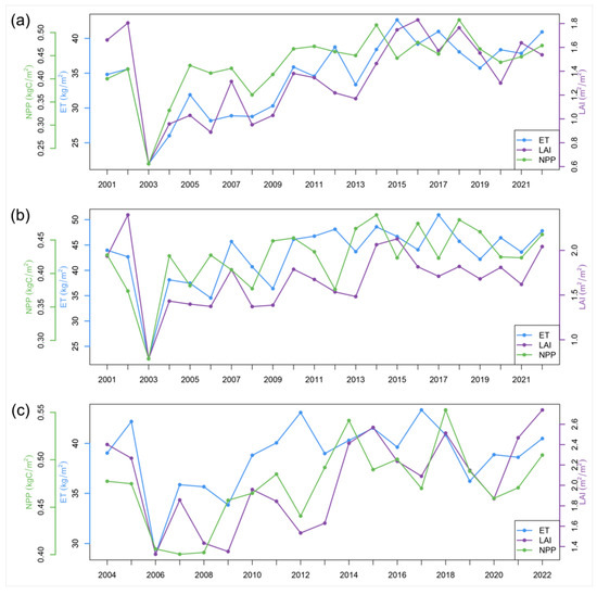 Interannual variation in the mean NPP, ET, and LAI for burned areas for the GH fire (a), Huma fire (b), and KDH fire (c) cases. We rescaled the y-axis to generate a consistent and straightforward comparison between ecosystem states.