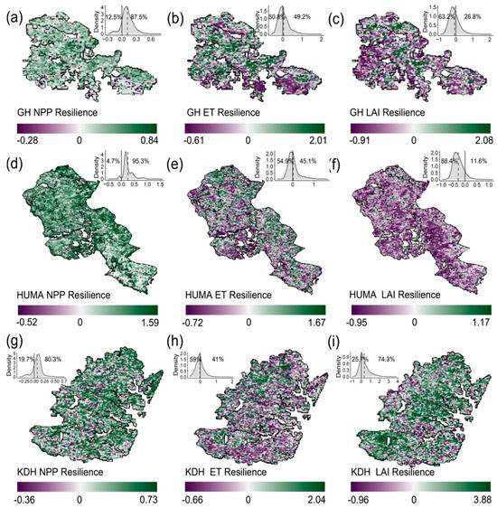 Map of the spatial distribution of ecosystem resilience derived from MODIS observations of structural and functional parameters for the GH (a–c), Huma (d–f), and KDH (g–i) fires. The probability density function plots in gray show the distributions of the resilience values of NPP (a,d,g), ET (b,e,h), and LAI (c,f,i). The dashed lines represent the mean values of the evaluated resilience.