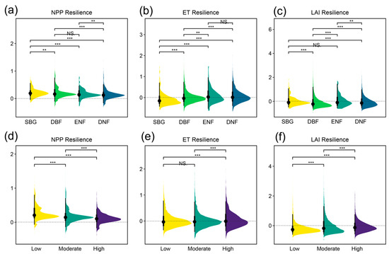 Raincloud plots combined with ANOVA to compare the differences in NPP resilience (a,d), ET resilience (b,e), and LAI resilience (c,f) according to prefire vegetation composition, and burn severity level. The vegetation types were classified as deciduous broadleaved forest (DBF), deciduous needle-leaved forest (DNF), evergreen needle-leaved forest (ENF) and shrub–grassland (SBG). Burn severity was classified into low, moderate or high levels according to the RdNBR thresholds derived from the Jenks natural breaks algorithm. *** denotes a significant difference at the p < 0.001 level, ** denotes a significant difference at the p < 0.01 level, and NS denotes non-significance.