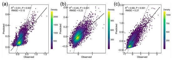 Density scatter plot of the goodness of fit between the evaluated resilience (observed) and model predictions (predicted) for NPP (a), ET (b), and LAI (c). The dashed lines represent the regression lines between the observed and predicted values, whereas the solid lines represent the 1:1 reference line.