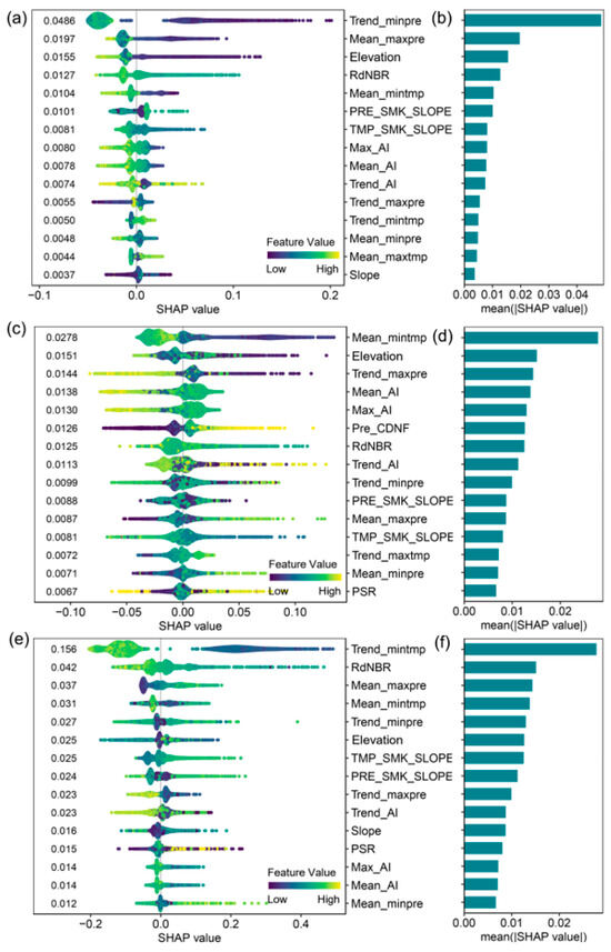 We used the SHAP value to evaluate the relative contribution of a given predictor variable to improve model performance when the variance in ecosystem resilience was fit. In addition to the global SHAP value (the mean absolute SHAP value) per explanatory variable (see Figure 7b,d,f), the GBM-SHAP model also generated a SHAP value for each training data point that was organized as a summary plot (see Figure 7a,c,e) to illustrate the range and distribution of impacts from the input predictors. The Trend_minpre variable of the NPP resilience model is set as an example (Figure 7a), and the summary plot shows that the higher values of this predictor decrease its SHAP values and therefore pull the prediction toward low resilience (negative). This result could be interpreted as the area with an increasing trend in the minimum monthly precipitation in the growing season (wetter in dry months), which could favor the suppression of NPP resilience.