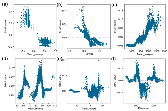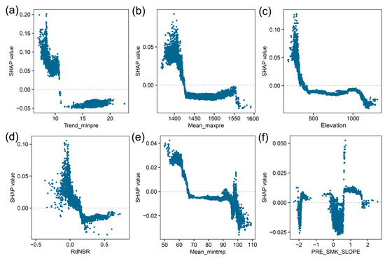 The partial dependence plot (PDP) approach was used to depict the response relationships between ecosystem resilience and explanatory predictors, as shown in Figure 8, Figure 9 and Figure 10. Owing to limited space and variable importance, only the top six variables ranked on the basis of the global SHAP values from the three resilience models are reported. As we described above, the GBM-SHAP model can handle nonlinear relationships between responses and predictors well. The point clouds in the PDP clearly demonstrated the potential regulatory mechanisms that drive postfire ecosystem response. It can also identify key thresholds of predictors at which the response may shift in impact magnitude or even direction.