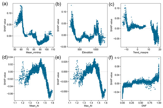 Partial dependence plots representing the nonlinear effects of the top six most important explanatory variables on ET resilience prediction, namely Mean_mintmp (a), Elevation (b), Trend_maxpre (c), Mean_AI (d), Max_AI (e), and DNF (f). A positive SHAP value means that the variable increases the predicted outcome, whereas a negative value indicates that the variable decreases the outcome. Please see Table 3 for a detailed explanation of the variables.