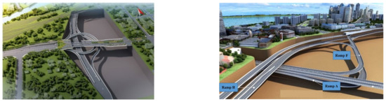 To meet the requirements of social development and urban construction, tunnel construction is evolving towards diversification, with underground interconnected tunnels becoming prominent. These tunnels are typically located in pivotal urban areas, alleviating traffic congestion and enhancing urban landscapes and environmental quality. Underground interconnected tunnels feature multiple branches and complex configurations of curvature radius and slopes [1], as illustrated in Figure 1. The presence of bifurcation structures leads to complex interaction mechanisms between fire smoke and tunnel ventilation system parameters. In the event of a fire, failure to promptly control and exhaust smoke in time may hinder external firefighting efforts and result in casualties [2,3]. Therefore, it is crucial to study the dispersion characteristics of fire smoke in such tunnels.