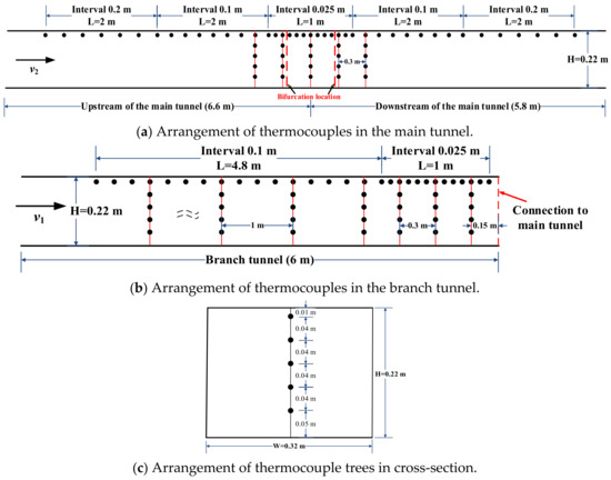 Figure 3 illustrates the arrangement of thermocouples in the tunnel. Positioned 0.01 m below the ceiling, the thermocouples were spaced longitudinally at intervals of 0.025 m near the fire source and at 0.1 m and 0.2 m further away. The measurement points on each thermocouple tree were set 0.04 m apart.