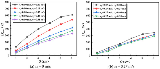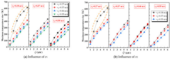 Therefore, based on the magnitude of , we divided the maximum temperature rise data into two parts for discussion. When , the influence of v2 can be neglected, and is analyzed based on alone. When , the influence of v2 becomes significant, and is analyzed by incorporating v2.
