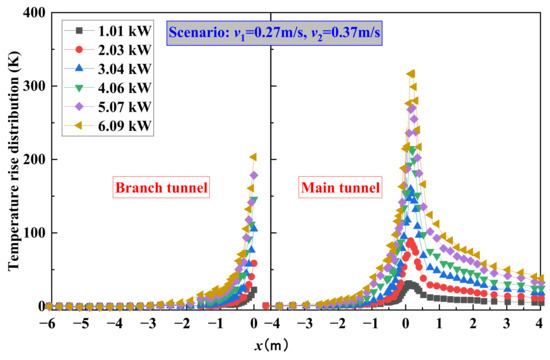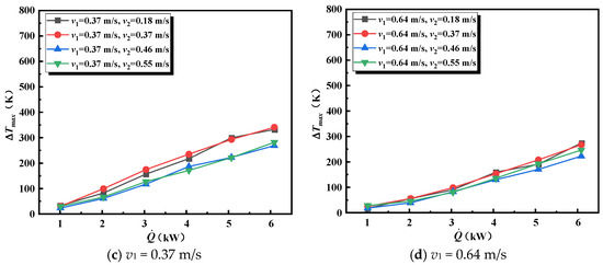 When the fire is positioned at the intersection of the mainline and branch tunnel axes, the longitudinal wind flow in both tunnels directly impacts the flame, which subsequently impacts the smoke temperature. Figure 4 illustrates the impact of the branch tunnel’s longitudinal velocity (v1) on the maximum temperature rise () when the main tunnel’s velocity (v2) is certain. Under natural ventilation conditions, the escalates from 132 K to 610 K with increasing HRR. The significantly decreases with longitudinal ventilation in the tunnel. According to Figure 4a–d, the decreases with increasing longitudinal velocity in the branch tunnel, provided that v2 remains constant. Furthermore, the reduction in diminishes as the main tunnel’s ventilation wind speed increases. For instance, at an HRR of 6.09 kW, the decreases from 610 K to 274 K with increasing longitudinal velocity in the branch tunnel at v2 = 0.18 m/s, compared to a decrease from 328 K to 246 K at v2 = 0.55 m/s.