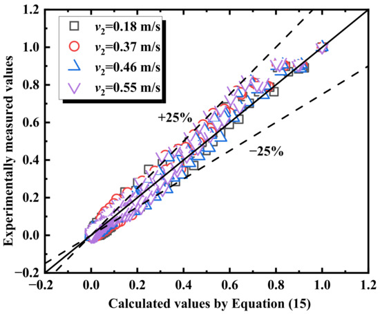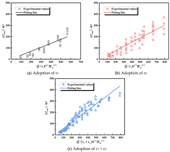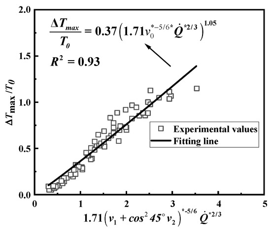 In studies on bifurcated tunnels, the maximum temperature rise prediction model proposed by Huang et al. [18] has been extensively utilized by researchers in this domain. The bifurcation angle between the main and branch tunnel in this study is 45°. Through the analysis of experimental data, we found that when fire source is located at d0, the influence of the main and branch tunnels’ velocity (v1, v2) on maximum temperature can be represented by v0, where . Referring to the study by Huang et al., the experimental data were analyzed using the dimensionless velocity . This section only considers the scenarios of cooperative ventilation, and the scenarios of single-tunnel ventilation is not discussed. In this case, is greater than 0.19.