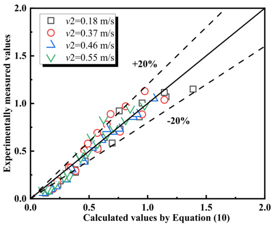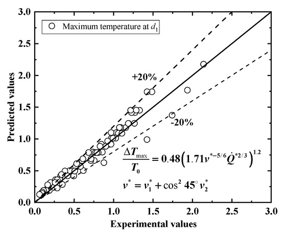 Through the analysis of experimental data at d1, it was found that the pattern follows the same trend as observed at the d0 position. The influence of ventilation in both tunnels on the maximum temperature rise can also be represented by . The dimensionless characteristic velocity is greater than 0.19 for the cooperative ventilation scenario at position d1. The two parameters in the maximum temperature rise prediction model are 0.48 and 1.2, as shown in Equation (11). Comparison with the experimental results reveals that the model predicts well, as demonstrated in Figure 10.