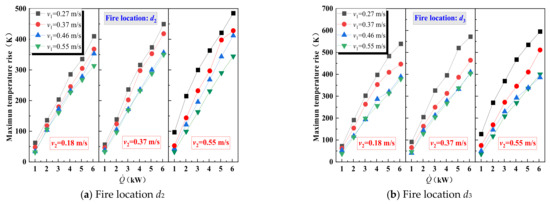 When the fire source moves into the branch tunnel (located at positions d2 and d3), the relationship between the maximum temperature and longitudinal velocity is shown in Figure 11. The trends between longitudinal velocity and maximum temperature rise are the same at both positions. Increasing the branch tunnel velocity (v1) still reduces the maximum temperature, while the influence of the main tunnel velocity (v2) on the temperature changes. Before the fire enters the branch tunnel, increasing v2 lowers the maximum temperature rise. After the fire enters the branch tunnel, as v2 increases, gradually rises. When v1 is low, v2 has a significant enhancing effect on the maximum temperature. In contrast, when v1 is high, v2 has minimal impact on the maximum temperature. This is because after the fire source moves into the branch tunnel, the airflow in the main tunnel partially impedes the downstream movement of smoke. A higher v2 strengthens this obstruction, leading to an increased accumulation of hot smoke within the branch tunnel and higher temperatures. However, when v1 is sufficiently large, the obstructing effect of the main tunnel airflow diminishes.