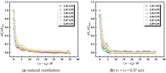 Figure 14 illustrates the dimensionless longitudinal temperature distribution under both natural and cooperative ventilation (with v1 = v2 = 0.37 m/s as representative scenarios). The analysis reveals that variation in the HRR minimally affects the dimensionless longitudinal temperature distribution. Consequently, we selected experiments with an HRR of 6.09 kW for detailed analysis of this temperature distribution.