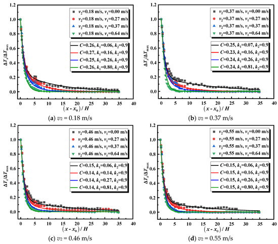 Equation (14) was applied to analyze the longitudinal temperature distribution in the branch tunnel, with results for position d0 depicted in Figure 15. It was found that the coefficient C remains constant with varying longitudinal velocities in the branch tunnel, provided that the main tunnel’s velocity is fixed. However, as the main tunnel’s velocity increases, coefficient C decreases until it stabilizes at 0.46 m/s. Unlike coefficient C, coefficient k1 varies solely with v1, increasing as this velocity increases. The coefficient k2 remains almost constant in all ventilation conditions, so we take the average value of 0.9 of k2 for all conditions to be fitted, which reduces the number of unknown variables and facilitates the establishment of the final unified model. Table 2. summarizes the temperature decay coefficients for the branch tunnel across various test cases.