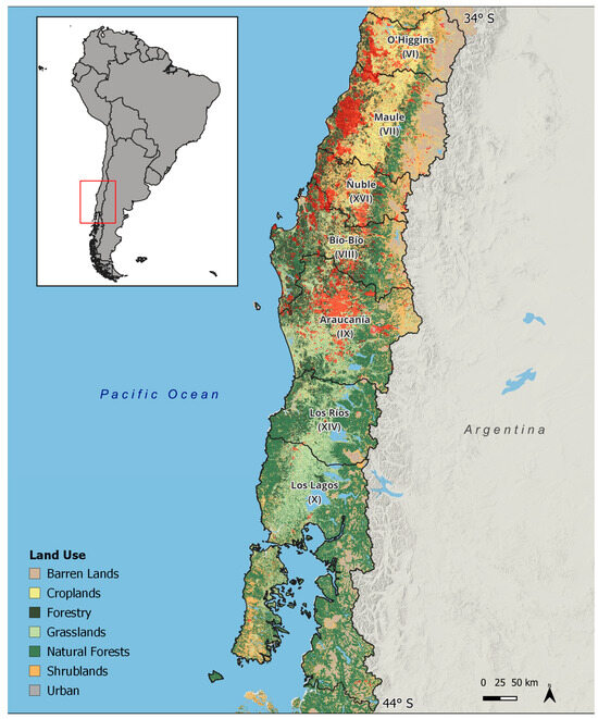 - McWethy, D.B.; Pauchard, A.; García, R.A.; Holz, A.; González, M.E.; Veblen, T.T.; Stahl, J.; Currey, B. Landscape drivers of recent fire activity (2001–2017) in south-central Chile. PLoS ONE 2018, 13, e0201195. [Google Scholar] [CrossRef]