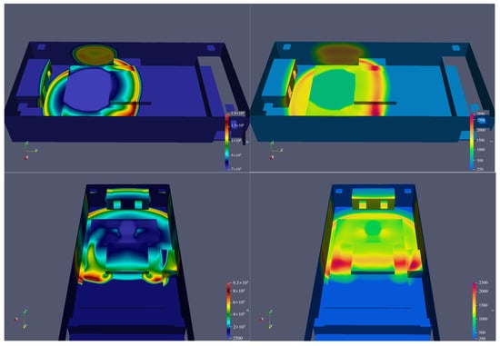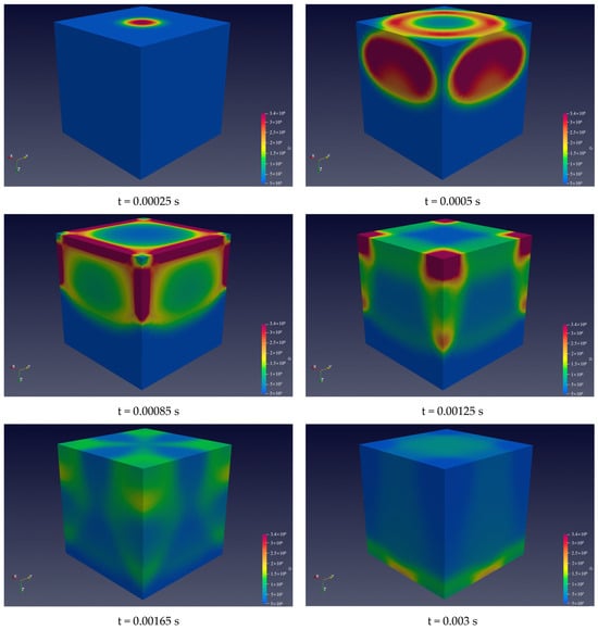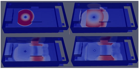 Figure 10 below presents the results of the test explosion simulation. It can be observed that as the explosion progresses, the shock wave exhibits a circular diffusion pattern, propagating outward from the center. Upon encountering a wall or fixed mechanical structure, reflection occurs, and multiple waves converge at specific points, generating new emission waves.