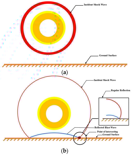 Reflection amplifies blast pressure intensity and occurs as regular or Mach reflection, determined by the incidence angle. In Mach reflection, identified by Ernst Mach and analytically confirmed by von Neumann (1941), a shock wave reflects off the ground (
