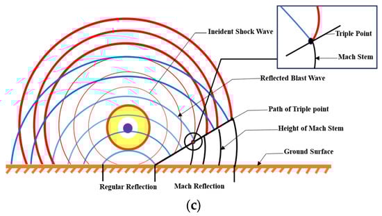 Figure 9b), forming a secondary wave that merges with the incident wave to create a high-overpressure Mach stem [