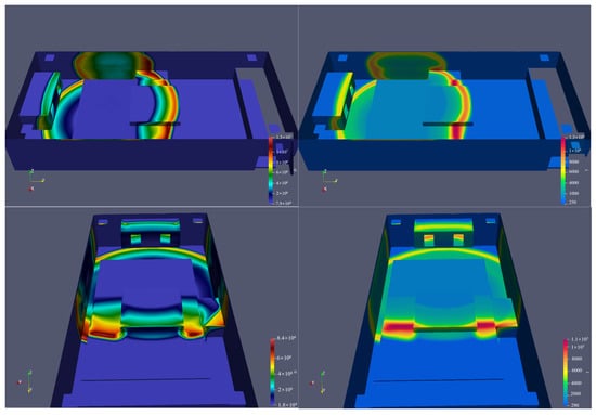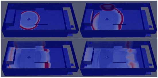 Figure 9a,b, a phenomenon commonly referred to as a reflected wave. Positioned centrally among the engine, control room, and generator, the explosion point generates the most complex and irregular waveforms due to interactions with waves from three directions and reflections from the cabin walls. In a homogeneous, isotropic medium, the pressure from the explosion propagates outward uniformly in all directions as concentric spheres.