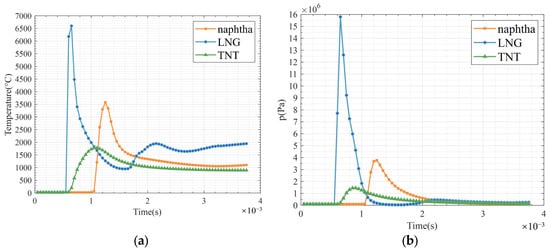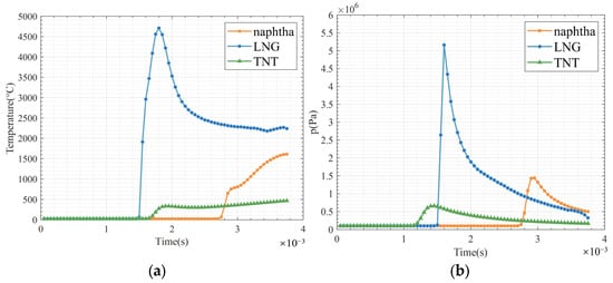 Figure 16a illustrates the temporal variations in temperature and pressure near the vent following the explosion of different materials—naphtha, LNG, and TNT—in a simulated engine room explosion. LNG exhibits the highest peaks, reaching a temperature of approximately 5500 °C and pressure of 5.8 × 10