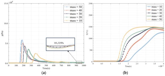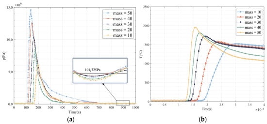 Figure 17, during the initial phase (0–0.0012 s), the environment remains stable, but pressure rises rapidly afterward, with larger masses reaching peaks faster. The explosion peaked at 0.0022 s with a pressure of about 6 × 10