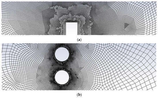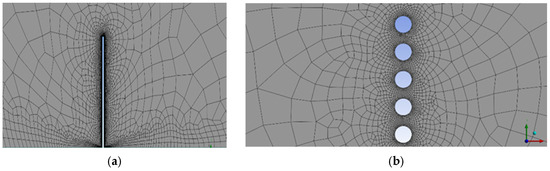 Appropriate mesh refinement is crucial to manage computational resources and avoid exceeding available memory. The initial mesh for the impermeable wall consisted of approximately 37,500 elements, predominantly quadrilateral elements, with element sizes of 1 mm and 2 mm near the wall and coarser elements further from the wall and ground (see Figure 1a). The porous fence was initially discretized using approximately 66,994 predominantly quadrilateral elements. The perimeter of each wire was divided into approximately 82 segments, with coarser elements employed away from the fence and ground (see Figure 1b). Adaptive mesh refinement was subsequently employed, focusing on regions exhibiting high residuals, primarily between the ground and a height of 6 m. This refinement process resulted in final mesh counts of 437,295 elements for the impermeable wall and 492,481 elements for the permeable fence. The final mesh distributions near critical regions are shown in Figure 2a,b for the impermeable wall and permeable fence, respectively.