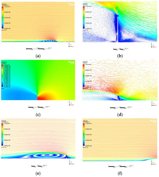 Flow around a 2 m high wall at a free-stream velocity of 10 m/s and 35 °C. (a) Streamlines within the computational domain; (b) velocity vectors near the wall; (c) pressure distribution showing high- and low-pressure regions; (d) magnified view of velocity vectors near the wall; (e) downstream streamlines showing vortex formation and downward trajectory; (f) streamlines returning to ground level.