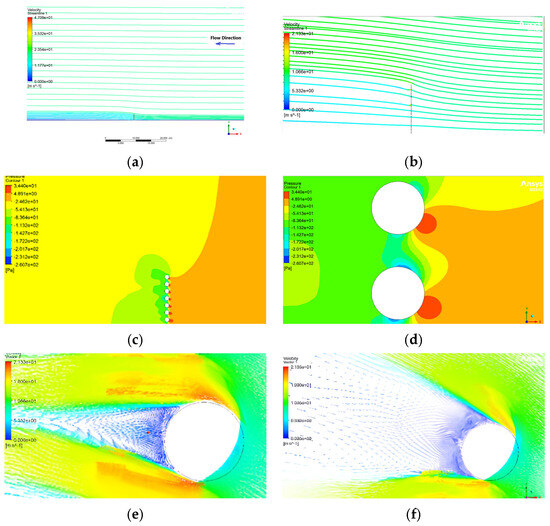 Flow around a 2 m high porous fence (38% porosity) at a free-stream velocity of 10 m/s and 35 °C. (a) Streamlines within the computational domain; (b) close-up view of streamlines near the fence; (c) pressure contours near the top wires; (d) magnified view of pressure variations around two top wires; (e) velocity vectors around a single wire; (f) velocity vectors near the topmost wires.