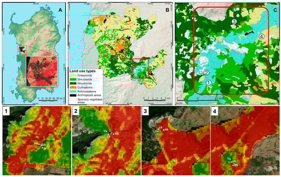 Location of the study areas. (A) burned area in relation to Sardinia Island (Western Mediterranean); (B) burned area in 2021; and (C) detail of the study area: the numbers indicate the investigated areas. The white triangles indicate the location of our plots (U: unburned plots, LS: low-severity fire, and HS: high-severity fire, according to dNBR severity classes) within each study area.
