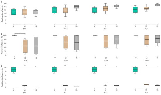 Boxplots of (A) total number of species, (B) total cover of species, and (C) total height of species in unburned (U), low-severity fire (LS), and high-severity fire (HS) plots during the years 2021, 2022, 2023, and 2024. The boxes show the interquartile range, the horizontal bars show median values, and the vertical bars show the top and bottom 25% quartiles. Statistically significant values are represented by asterisks: * = p < 0.05; ** = p < 0.01.