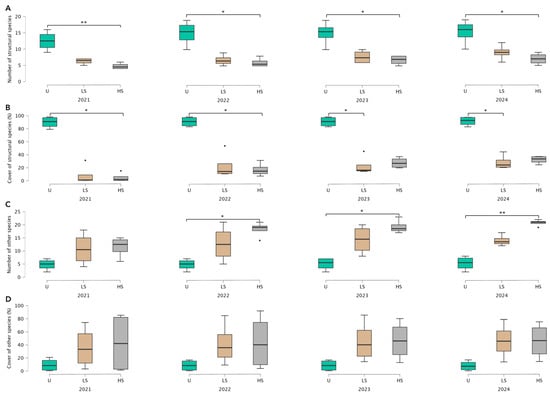 Boxplots of (A) number of structural species, (B) cover of structural species, (C) number of other species, and (D) cover of other species in unburned (U), low-severity fire (LS), and high-severity fire (HS) plots during the years 2021, 2022, 2023, and 2024. The boxes show the interquartile range, the horizontal bars show median values, and the vertical bars show the top and bottom 25% quartiles. Statistically significant values are represented by asterisks: * = p < 0.05; ** = p < 0.01.