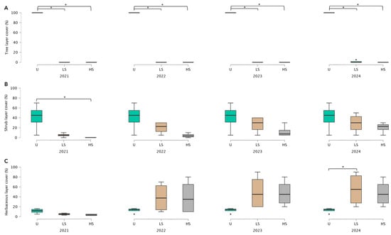 Boxplots of (A) tree layer cover, (B) shrub layer cover, and (C) herbaceous layer cover in unburned (U), low-severity fire (LS), and high-severity fire (HS) plots during the years 2021, 2022, 2023, and 2024. The boxes show the interquartile range, the horizontal bars show median values, and the vertical bars show the top and bottom 25% quartiles. Statistically significant values are represented by asterisks: * = p < 0.05.